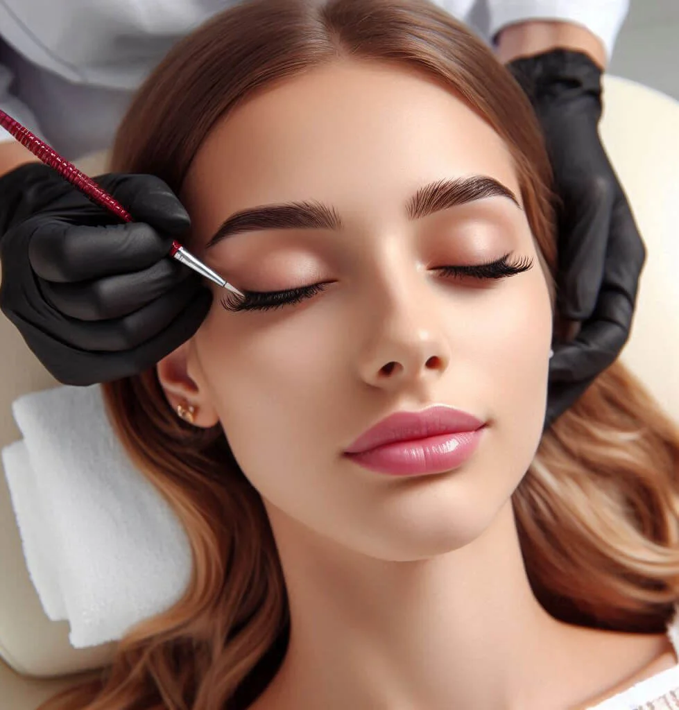 - Брови — форма, густота и цвет подбираются под черты лица. Популярны техники микроблейдинга, метод микропигментации и волосковая техника.