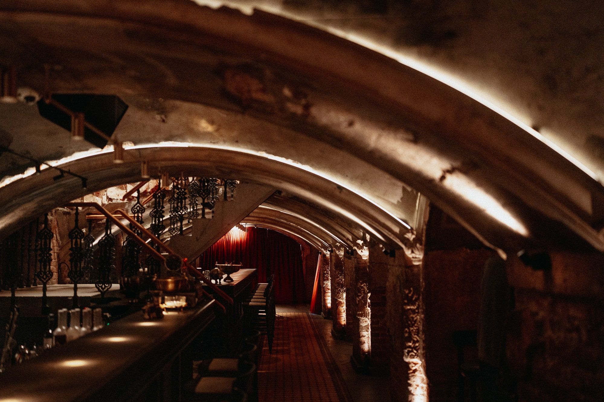 Архитектурное решение сохранило дух императорской типографии. Кирпичные своды получили новую жизнь благодаря ручной росписи с тайными смыслами, арт-объектами в нишах и отреставрированной барной стойке со светящимся ониксом.