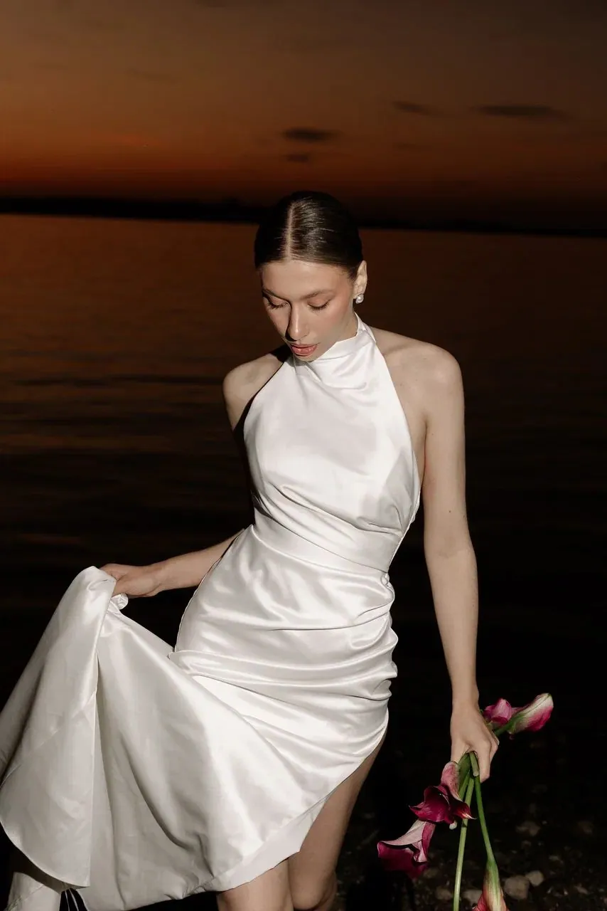 - Шелк: Легкий и струящийся материал, идеальный для летней свадьбы.